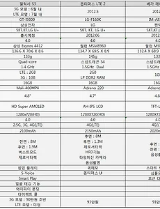 스마트폰이 국내 확산이 활성화 된 시기가 2010년.휴대폰 약정이 2년인 관계로 기기변경 주기가 2년이 되어버립니다. 2012년 반전을 노리는 LG, 입지를 강화하려는 팬택, 제왕의 자리에서 내려오려고 하지 않는 삼성. 그 두번째 전쟁.예전엔 창, 검, 활들고 싸운 느낌이라고 하면... 이제는 총,대포 정도는 갖추고 싸운다는 비유가 적절하려나요? [갤럭시 S III, 옵티머스 LTE 2, 베가레이서 2 디바이스 이미지] [갤럭시 S III, 옵티머스 LTE 2, 베가레이서 2 스펙 비교표] 다 못담은 기능들도 있지만, 상당히 다양한 기능이 포함되어 있는 스마트 디바이스들 입니다.예전에 사용하던 디바이스에서는 상상도 못할 기능들이 들어가있죠. 왠만한 똑딱이를 넘어서는 카메라 기능 예전에 나왔던 PMP 급 ..